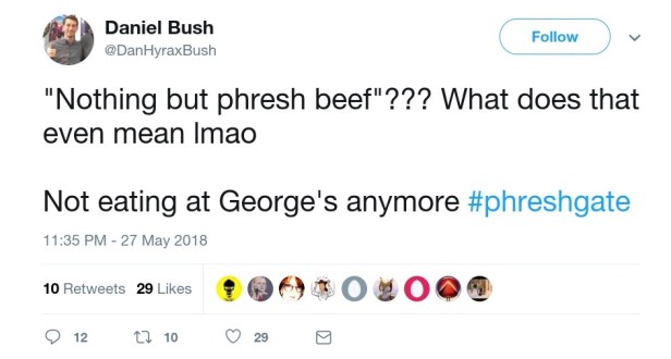 Controversy began Sunday night on Twitter after George’s ran the first in a new line of TV promos using the modified slogan. Twitter user @DanHyraxBush was the first to express his suspicion.
